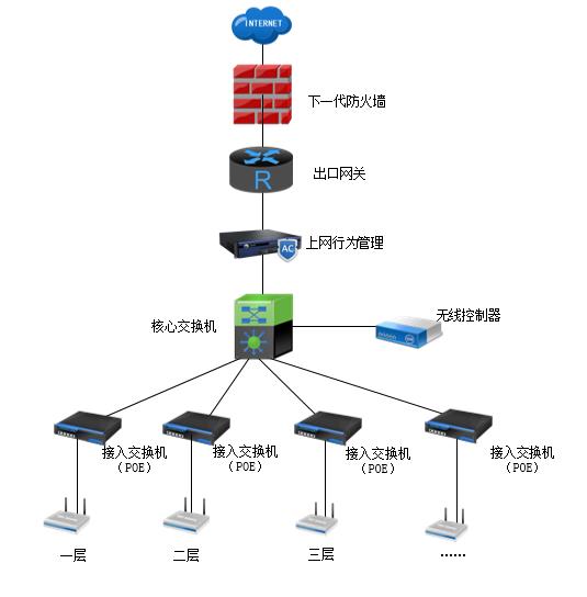 - 无线控制器对面板AP 、高密AP 、吸顶AP进行统一网络 配置 ,并实现酒店的认证漫游, 住客在酒店内移动上网及下次来时无需重复认证 ;