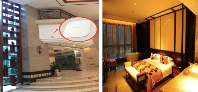 - 该森林温泉大酒店总共 182 间客房, 每 1个房间部署一台面板式 AP , 解决房间隔多、 墙壁厚、信号差的问题, 保证客房内每个角落都有信 号;