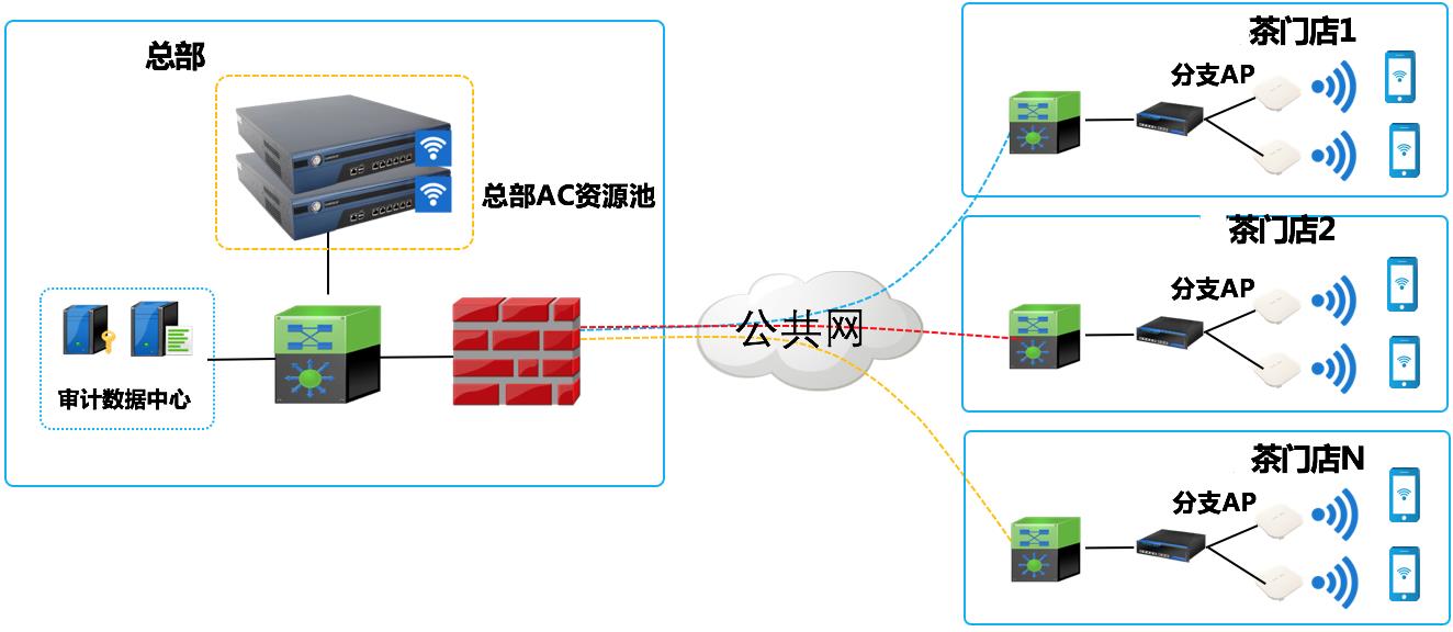 该品牌集团旗下近百余家茶饮门店无线建设,要求除了提供优质的无线上网外,还能帮助品牌吸收微信粉丝、广告推送、数据收集等增值营销功能,并且需要实现集团总部的统一管理,通过集团总部可以统一管理全国近百余家茶饮门店的运维,同时实现各个门店的认证漫游。